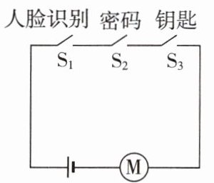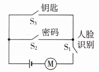 7.B 【点拨】由题意可知,“人脸识别”与输入“密码”匹配成功,或“人脸识别”与使用“钥匙”匹配成功才可开锁,即只要有一个条件满足,电动机就工作,所以“人脸识别”开关与电动机应在干路上,“密码”开关与“钥匙”开关并联。