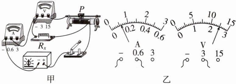 (2)试触后,电表选择合适量程,闭合开关,调节滑动变阻器,电流表、电压表示数如图乙,则$R_{x}$的阻值为______$\Omega$。(结果保留1位小数)