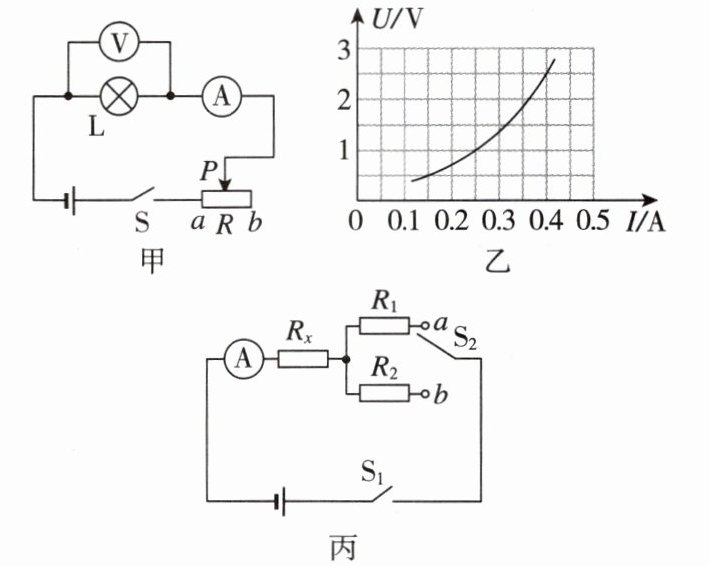 (5)小刚学习了单表测电阻后设计的电路如图丙所示,电阻$R_{1}$、$R_{2}$为定值电阻,电源电压保持不变。当开关$S_{1}$闭合,$S_{2}接a$端时,电流表示数为$I$;当开关$S_{1}$闭合,$S_{2}接b$端时,电流表示数为$2I$,则未知电阻$R_{x}$的阻值是