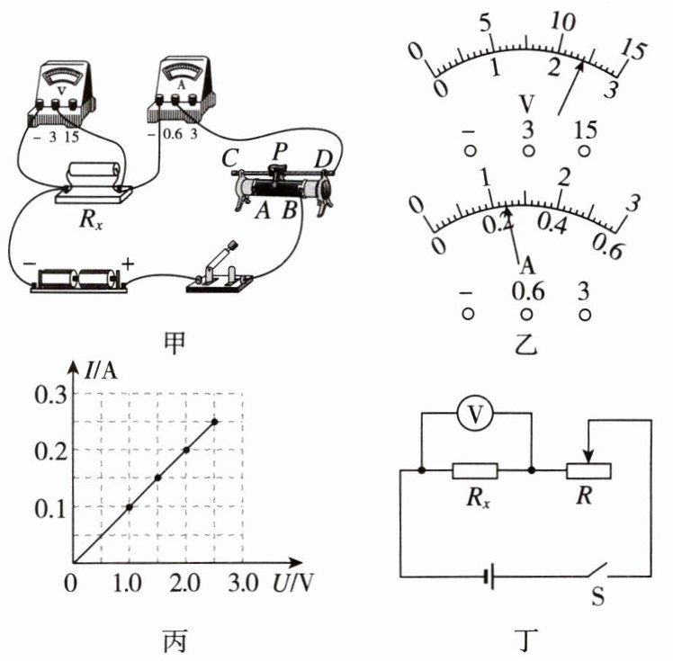 $\Omega$。(4)实验中,由于同组的其他同学操作失误使得电流表被烧坏,于是设计了如图丁所示的电路对$R_{x}$的阻值进行测量,已知滑动变阻器的最大阻值为$R$,实验步骤如下: