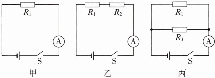(3)由图丙可知,$R_{1}$与$R_{3}$并联,电流表测量干路中的电流,电流表的示数$I_{丙}=3.6\ A$,根据并联电路电流规律可得,通过$R_{3}$的电流$I_{3}=I_{丙}-I_{1}=I_{丙}-I_{甲}=3.6\ A-2.4\ A=1.2\ A$,由并联电路电压的规律和欧姆定律可得$R_{3}=\frac{U_{3}}{I_{3}}=\frac{U}{I_{3}}=\frac{12\ V}{1.2\ A}=10\ \Omega $。