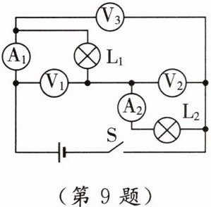 9. [2024·南充,多选] 如图,开关S闭合后,电流表的示数分别为$I_{1}$、$I_{2}$,电压表的示数分别为$U_{1}$、$U_{2}$、$U_{3}$,$L_{1}的电阻小于L_{2}$的电阻,则下列关系中正确的是(