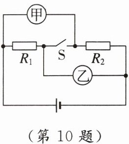 10. 科学思维·科学推理 如图所示的电路中,电源电压U保持不变。若在甲、乙两处都接入电流表,断开开关S,则$I_{甲}:I_{乙}= 3:5$。若在甲、乙两处都接入电压表,闭合开关S,则$U_{甲}:U_{乙}= $