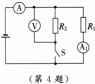 4. [2024·葫芦岛期中]如图所示,电源电压保持不变,电阻$R_{1}= 15\Omega$,$R_{2}= 10\Omega$。闭合开关$S$,电流表$A_{1}$的示数