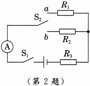 2. (科学思维 科学推理)如图所示,电源电压恒定,$R_{1}= 12\Omega$,$R_{2}= 6\Omega$,$R_{3}$是定值电阻。闭合开关$S_{1}$,单刀双掷开关$S_{2}接a时电流表的示数为0.6A$,接$b$时电流表的示数可能为(