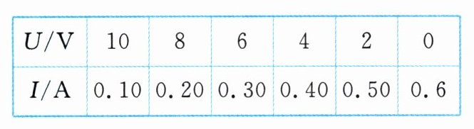 D 【点拨】由图可知,定值电阻R₀与滑动变阻器串联,电流表测电路中的电流,电压表并联在滑动变阻器两端,测滑动变阻器两端的电压。由表中数据可知,当滑动变阻器两端的电压为零时,滑动变阻器接入电路中的阻值为零,此时只有R₀接入电路,且电路中的电流I₁=0.6 A,则电源电压U=I₁R₀=0.6 A×R₀,当滑动变阻器两端的电压为10 V时,电流中的电流I₂=0.1 A,电源电压U=U滑+U₁=U滑+I₂R₀=10 V+0.1 A×R₀,因电源电压不变,由①②式解得R₀=20 Ω,U=12 V;由表中数据可知,当电路中电流为0.6 A时,电压表示数为0,即滑动变阻器连入电路的阻值为0;因电源电压U=12 V,当电压表示数为6 V时,R₀两端的电源U'=U-U₂=12 V-6 V=6 V,根据串联电路的分压原理可知,滑动变阻器连入电路中的阻值与R₀阻值相等,为20 Ω。