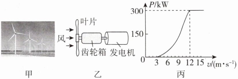 9. 2025·德州月考 跨学科·工程实践 如图甲是我国某风力发电基地,风力发电机组主要由叶片、齿轮箱、发电机等组成,其简化结构如图乙所示。发电机所发的电通过电缆输送到升压变压器提升电压后,由高压输电线路输送给用户。风力发电机组输出功率P与风速v的关系如图丙所示。(为方便计算,图中数据已进行简化处理)风速为13m/s时,风力发电机组工作2h输出的电能为