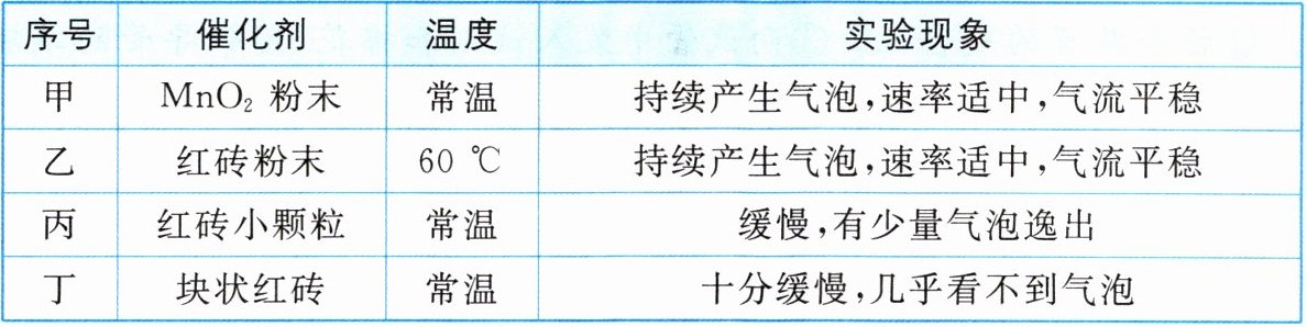 (填实验序号)。(2)温度控制在60℃时,另取2g红砖小颗粒,向其中加入20mL8%的过氧化氢溶液,继续实验,发现产生气泡的速率明显比实验丙快。请分析可能的原因: