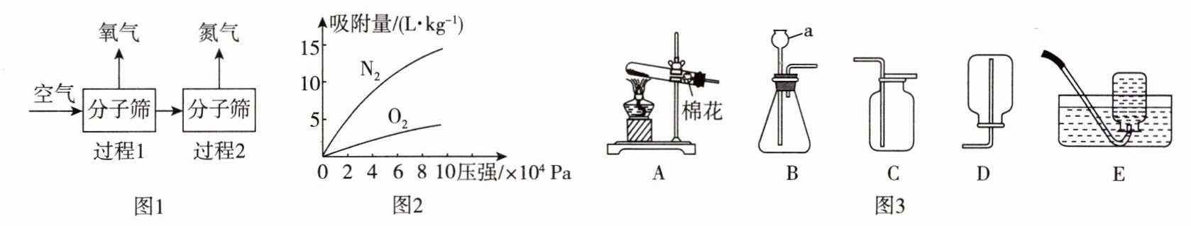 (1) 变压吸附法是工业上常用的制氧方法。变压吸附法的部分简易流程如图 1 所示,其原理是利用分子筛吸附氮气和氧气能力的差异,在分子筛中通过加压与减压的交替循环将二者进行分离,可连续生产大量纯度较高的氧气。已知分子筛吸附材料释放气体后会恢复吸附能力,分子筛对氮气、氧气的吸附能力如图 2 所示。过程 1 中空气通过分子筛吸附材料时,采用