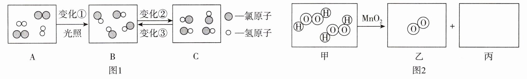 (2)由题图1可知,变化①为氢气和氯气在光照条件下反应生成氯化氢,该反应属于化合反应;由题图1可知,该反应中最小的粒子是氢原子、氯原子,所以化学变化中最小的粒子是原子。