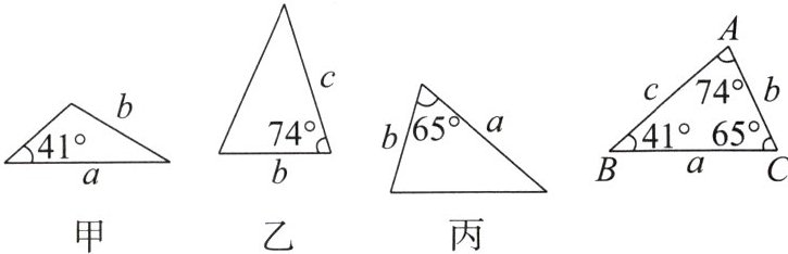1. 如图,已知$\triangle ABC$的六个元素,下面甲、乙、丙三个三角形中标出了某些元素,则与$\triangle ABC$全等的三角形是(