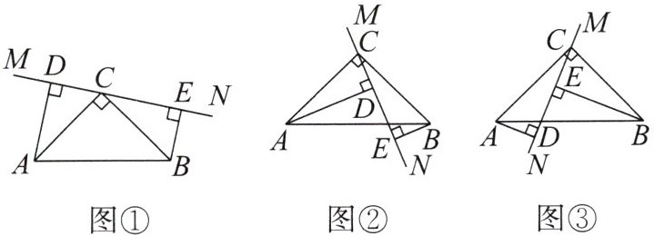 (1)当直线$MN绕点C$旋转到图①的位置时,求证:①$\triangle ADC\cong\triangle CEB$;②$DE= AD+BE$。
