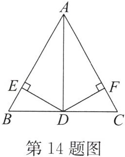 14. 如图, 已知在 $ \triangle ABC $ 中, $ AB = AC $, $ AD $ 是 $ \triangle ABC $ 的角平分线, $ DE \perp AB $ 于点 $ E $, $ DF \perp AC $ 于点 $ F $, 则下列结论: