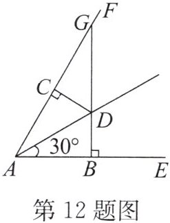12. 如图, 若 $ DB \perp AE $ 于点 $ B $, $ DC \perp AF $ 于点 $ C $, 且 $ DC = DB $, $ \angle BAD = 30° $, 则 $ \angle DGF = $ ______