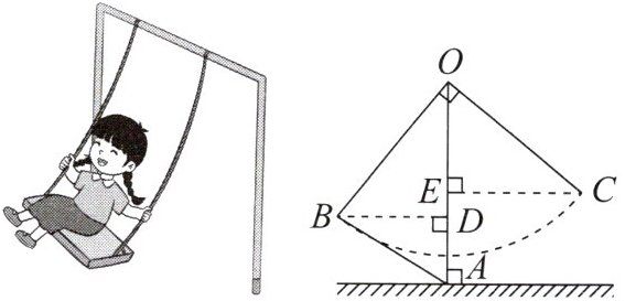 10. 小丽与爸妈在公园里荡秋千. 如图 (示意图), 小丽坐在秋千的起始位置 $ A $ 处, $ OA $ 与地面垂直, 两脚在地面上用力一蹬, 妈妈在距地面 1 m 高的 $ B $ 处接住她后用力一推, 爸爸在 $ C $ 处接住她. 若妈妈与爸爸到 $ OA $ 的水平距离 $ BD $, $ CE $ 分别为 1.4 m 和 1.8 m, $ \angle BOC = 90° $. 爸爸在 $ C $ 处接住小丽时, 小丽距离地面的高度是 (