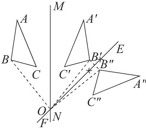(2)如图,连接BO,B'O,B"O.因为△ABC与△A'B'C'关于直线MN对称,所以∠BOM=∠B'OM.又因为△A'B'C'与△A"B"C"关于直线EF对称,所以∠B'OE=∠B"OE.所以∠BOB"=∠BOM+∠B'OM+∠B'OE+∠B"OE=2(∠B'OM+∠B'OE)=2∠MOE=2α.