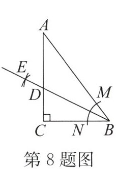 8. 如图,在 $ \triangle ABC $ 中,$ \angle C = 90° $,$ BC = 6 $,$ AC = 8 $,$ AB = 10 $,以点 $ B $ 为圆心,适当长为半径作弧,分别交 $ AB $,$ BC $ 于点 $ M $,$ N $,再分别以点 $ M $ 和点 $ N $ 为圆心,大于 $ \frac{1}{2}MN $ 的长为半径作弧(弧所在圆的半径都相等),两弧交于点 $ E $,作射线 $ BE $ 交 $ AC $ 于点 $ D $,则线段 $ CD $ 的长为( )