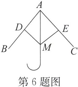 6. 雨伞在开合过程中某时刻的截面示意图如图所示,伞骨 $ AB = AC $,点 $ D $,$ E $ 分别是 $ AB $,$ AC $ 的中点,$ DM $,$ EM $ 是连接弹簧和伞骨的支架,且 $ DM = EM $,已知弹簧 $ M $ 在向上滑动的过程中,总有 $ \triangle ADM \cong \triangle AEM $,其判定依据是(
