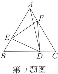 9. 如图,在 $ \triangle ABC $ 中,$ AB = AC $,$ D $ 是 $ BC $ 上的一点,在 $ AB $,$ AC $ 上分别截取 $ BE = CD $,$ CF = BD $,连接 $ DE $,$ DF $,$ EF $,$ AD $。有下列结论:① $ \angle EDF = 90° - \frac{1}{2}\angle BAC $;② $ \angle EDF = \angle B $;③ $ AD \perp BC $;④ $ \angle DEF = \angle DFE $。其中正确结论的序号是(