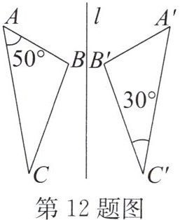 12. 如图,$ \triangle ABC $ 和 $ \triangle A'B'C' $ 关于直线 $ l $ 对称,若 $ \angle A = 50° $,$ \angle C' = 30° $,则 $ \angle B $ 的度数为
