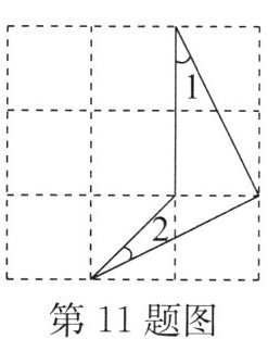 11. 如图,已知方格纸中有 9 个相同的小正方形,则 $ \angle 1 + \angle 2 $ 的度数为 $ $ $° $。