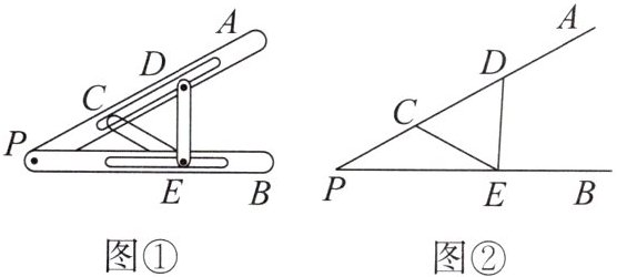14. “三等分角”是古希腊三大几何问题之一,借助如图①所示的三等分角仪可以三等分角。这个三等分角仪的示意图如图②所示,有公共端点 $ P $ 的两条线段 $ PA $,$ PB $,可以绕点 $ P $ 转动,点 $ C $ 固定,点 $ D $,$ E $ 在槽中可以滑动,且 $ CE = DE = CP $。若 $ \angle DEB = 87° $,则 $ \angle P $ 的度数为 $ $
