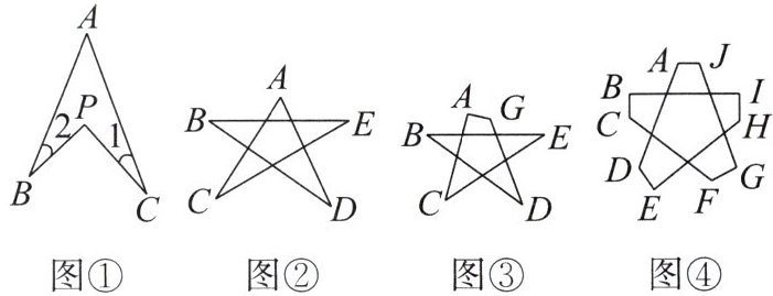 【提升思维】如图④,将五角星的每个角都截去,则一共得到 10 个角,则 $ \angle A + \angle B + \angle C + \angle D + \angle E + \angle F + \angle G + \angle H + \angle I + \angle J = $ $ $。