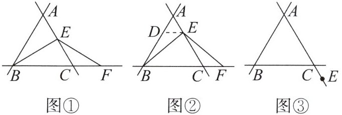 (2)“奋斗”小组受此问题的启发,提出问题:若点 $ E $ 是线段 $ AC $ 上的任意一点,其他条件不变,(1)中的结论是否成立?该小组认为结论仍然成立,理由如下:如图②,过点 $ E $ 作 $ ED // BC $,交 $ AB $ 于点 $ D $。请你补充完整证明过程。