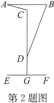 2. 某款带底座无人机简易模型的示意图如图所示,其中$AB // EF$,$CG \perp EF$,若$∠ACD = 105^{\circ}$,$∠B = 69^{\circ}$,则$∠A + ∠BDC$的度数是( )