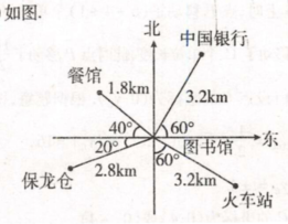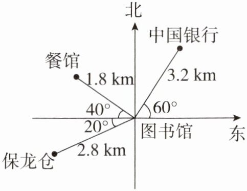 (1) 以图书馆为参照点,请用方向角和图中所标示的距离分别表示保龙仓、中国银行和餐馆的位置;