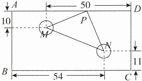 12. 如图,长方形零件图$ABCD$中,$BC = 2AB$,两孔中心$M$,$N$到边$AD$上点$P$的距离相等,且$MP\perp NP$,相关尺寸如图所示,求两孔中心$M$,$N$之间的距离.