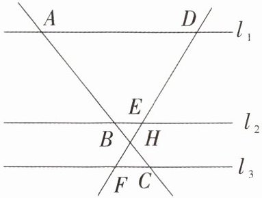6. 如图,直线 $ l_{1} // l_{2} // l_{3} $,直线 $ AC $ 分别交 $ l_{1} $,$ l_{2} $,$ l_{3} $ 于点 $ A $,$ B $,$ C $,直线 $ DF $ 分别交 $ l_{1} $,$ l_{2} $,$ l_{3} $ 于点 $ D $,$ E $,$ F $,$ AC $ 与 $ DF $ 相交于点 $ H $,如果 $ AB = 5 $,$ BH = 1 $,$ CH = 2 $,那么 $ \frac{EF}{DE} $ 的值等于(
