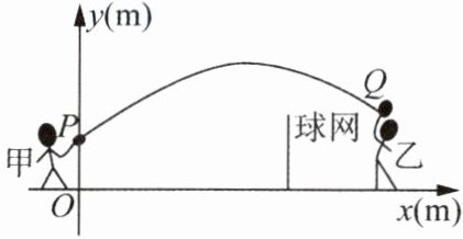 7. 甲、乙两人进行羽毛球比赛,羽毛球飞行的路线为抛物线的一部分,如图所示,甲在 $ O $ 点正上方 $ 1 $ m 的 $ P $ 处发出一球,羽毛球飞行的高度 $ y $(m)与水平距离 $ x $(m)之间满足函数表达式 $ y = -\frac{1}{24}(x - 4)^2 + h $,已知点 $ O $ 与球网的水平距离为 $ 5 $ m,球网的高度为 $ 1.55 $ m.