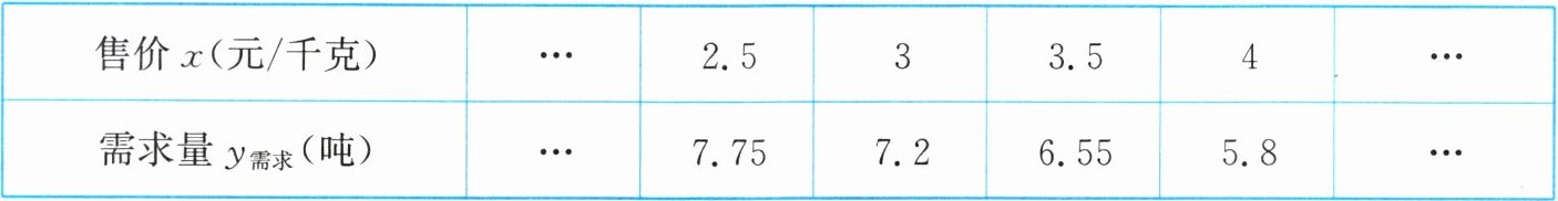 ①统计售价与需求量的数据,通过描点(图 1),发现该蔬菜需求量 $ y_{需求} $(吨)关于售价 $ x $(元/千克)的函数图象可以看成抛物线,其表达式为 $ y_{需求} = ax^{2}+c $,部分对应值如下表: