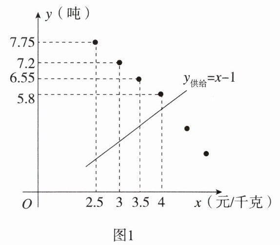 ②该蔬菜供给量 $ y_{供给} $(吨)关于售价 $ x $(元/千克)的函数表达式为 $ y_{供给} = x - 1 $,函数图象见图 1.