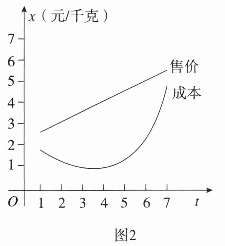 ③ $ 1\sim7 $ 月份该蔬菜售价 $ x_{售价} $(元/千克)、成本 $ x_{成本} $(元/千克)关于月份 $ t $ 的函数表达式分别为 $ x_{售价}= \frac{1}{2}t + 2,x_{成本}= \frac{1}{4}t^{2}-\frac{3}{2}t + 3 $,函数图象见图 2.