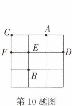 10. 如图,在$3×3$的方格中,$A$,$B$,$C$,$D$,$E$,$F$均位于格点上,从$C$,$D$,$E$,$F$四点中任取一点,与点$A$,$B$组成三角形,则所组成的三角形为等腰三角形的概率是