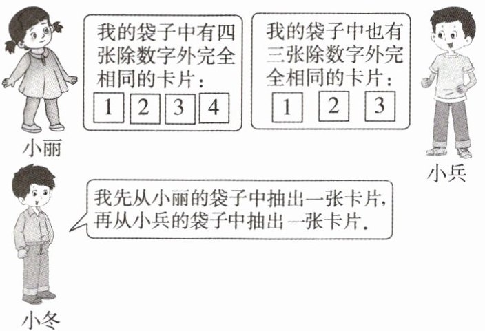 (1) 分别用 $ a$,$ b$ 表示小冬从小丽、小兵袋子中抽出的卡片上标有的数字,请用画树状图或列表法写出 $ (a,b)$ 的所有取值;