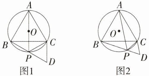 (1) 若 $AP$ 过圆心 $O$,如图 $1$ 所示,请你判断 $\triangle PDC$ 是什么三角形,并说明理由;