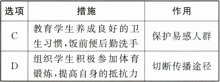 2. (2024宜宾中考)学校为了防止流感病毒的传播采取了多项措施。下列措施和作用对应关系最恰当的是(