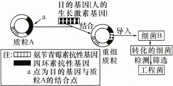 11. 图示环状DNA(质粒A)上含氨苄青霉素抗性基因和四环素抗性基因。现将人的生长激素基因由a点切开嫁接到质粒A上形成重组质粒,将重组质粒导入细菌B并获取“工程菌”进行培养。结果人的生长激素基因及氨苄青霉素抗性基因都能成功表达,而四环素抗性基因不能表达。这说明(