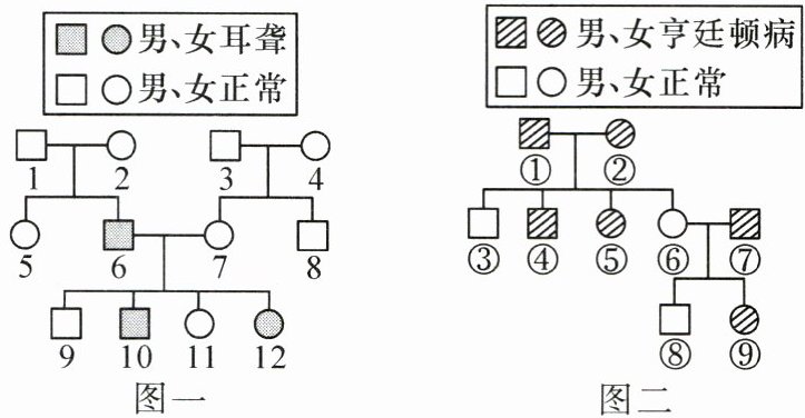 11. 图一是人类耳聋遗传的家族遗传图解,图二是人类亨廷顿病的家族遗传图解,它们都是由常染色体上的一对基因控制的遗传病。控制耳聋遗传的一对基因用 D、d 表示,控制亨廷顿病遗传的一对基因用 A、a 表示。请分析并回答: