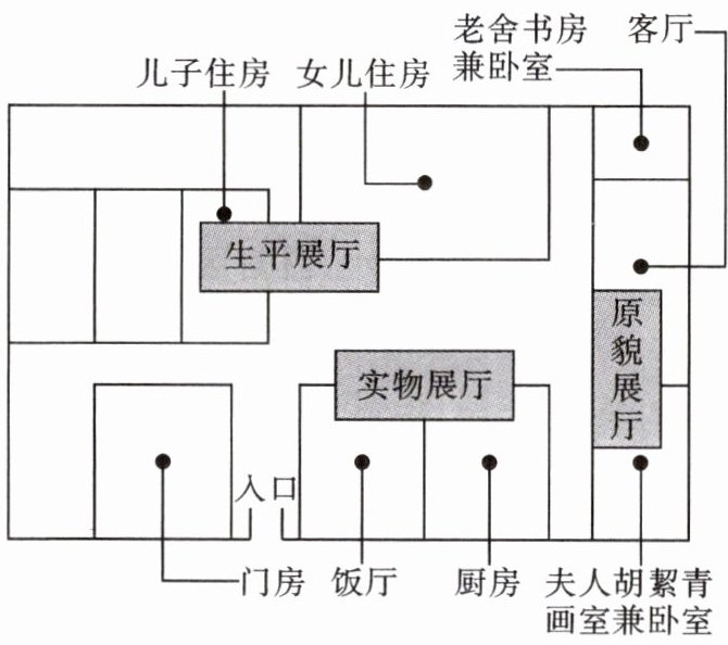 (1)示例:进门后,先游览实物展厅,这里包括饭厅、厨房等,接下来参观原貌展厅,有老舍夫人画室兼卧室、客厅、老舍书房兼卧室,最后参观生平展厅,分别为老舍女儿和儿子曾经的住房。