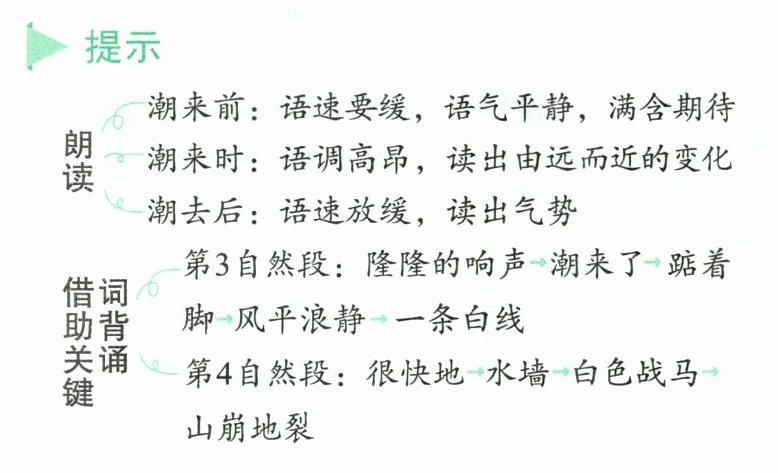 3.这首诗的前两句写的是潮来的时间及其声响、气势,课文中与前两句诗相关的句子是:①农历八月十八是一年中传统的观潮日。②午后一点左右,从远处传来隆隆的响声,好像闷雷滚动。③再近些,只见白浪翻滚,形成一堵高高的水墙。浪潮越来越近,犹如千万匹白色战马齐头并进,浩浩荡荡地飞奔而来;那声音如同山崩地裂,好像大地都被震得颤动起来。 这首诗的后两句写的是大潮退去的情景,课文中与后两句诗相关的句子是:霎时,潮头奔腾西去,可是余波还在漫天卷地般涌来,江面上依旧风号浪吼。