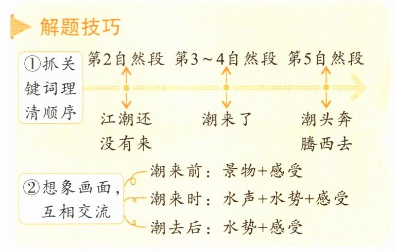 (1)课文是按照“潮来前—潮来时—潮去后”的顺序描写钱塘江大潮的。