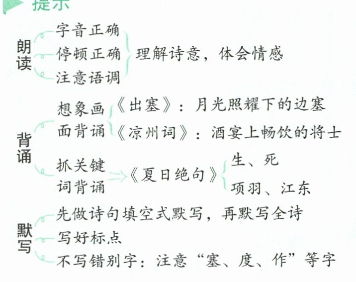 - 提示:朗读:字音正确,停顿正确,理解诗意,体会情感,注意语调。背诵:想象画面背诵《出塞》:月光照耀下的边塞;面背诵《凉州词》:酒宴上畅饮的将士。默写:抓关键词背诵《夏日绝句》:生、死、项羽、江东。先做诗句填空式默写,再默写全诗。写好标点,不写错别字:注意“塞、度、作”等字。