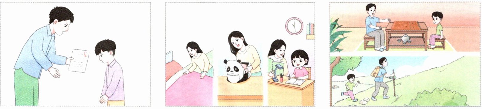 教材上呈现了三位父母对孩子爱的不同方式。你怎么看待这三个事例中爸爸妈妈的做法?在生活中遇到类似的事情时,你是怎么想的,又是怎么做的?和同学交流。