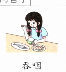 - tūn:形近字“蚕”,同音字“一”,3 + 4画,上下,吞咽。笔顺:口 吞 吞 吞。字义:不经咀嚼,整个咽到肚子里。组词:吞(吞咽)(吐露)(吞食)(慢吞吞)(忍气吞声)。辨字:舌(舌尖)(舌头)(七嘴八舌)(唇枪舌剑)。造句:吃饭时要慢慢吞咽,否则不利于消化。