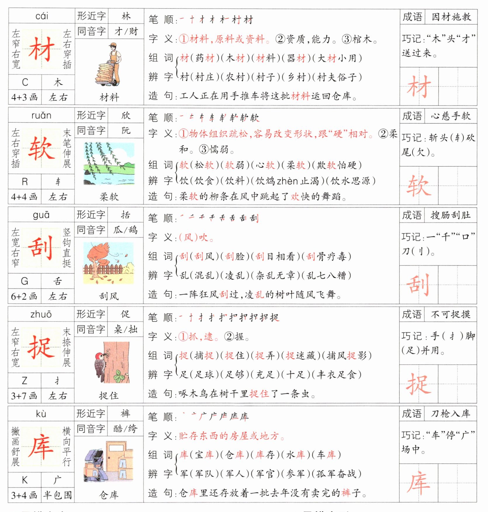 | cái | 形近字 | 林 | 笔顺 | 一 一 一 一 一 一 材 材 | 成语 | 因材施教 |