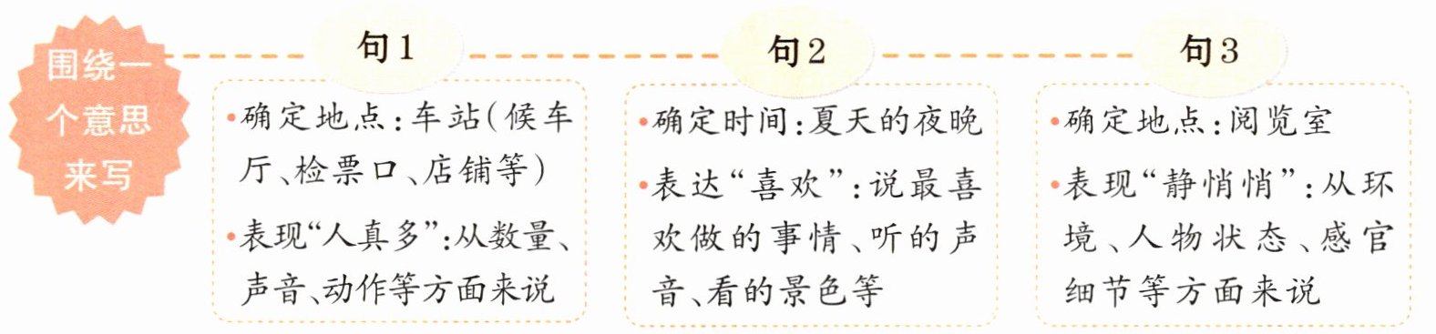 - 句1:确定地点:车站(候车厅、检票口、店铺等);表现“人真多”:从数量、声音、动作等方面来说